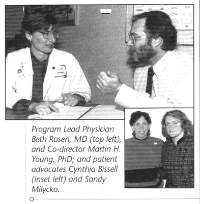 support are critical components. Milyko, who has cerebral palsy, also specializes in counseling families on self-advocacy. "Self-advocates are people learning to stand up for themselves in getting basic things - from jobs to health insurance to personal support - that most people take for granted," she explains. At the same time they are assisting families, family health supporters are educating the medical staff. Says Rosen, "Cindy and Sandy have been well-received by patients, and have informed me and other providers about what's available outside of UMass." |