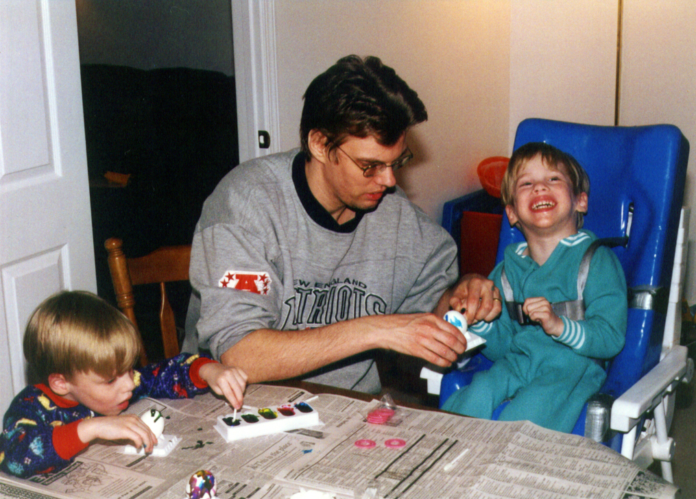 The boys at four now weigh in at around 30 pounds each. Aaron breathes through a tracheostomy tube and has some residual respiratory problems, but in all other ways he is like any other toddler, exploring and examining every new object as if it is some scientific breakthrough. Unable to vocalize, he makes all kinds of interesting creative noises and grins at his own cleverness.